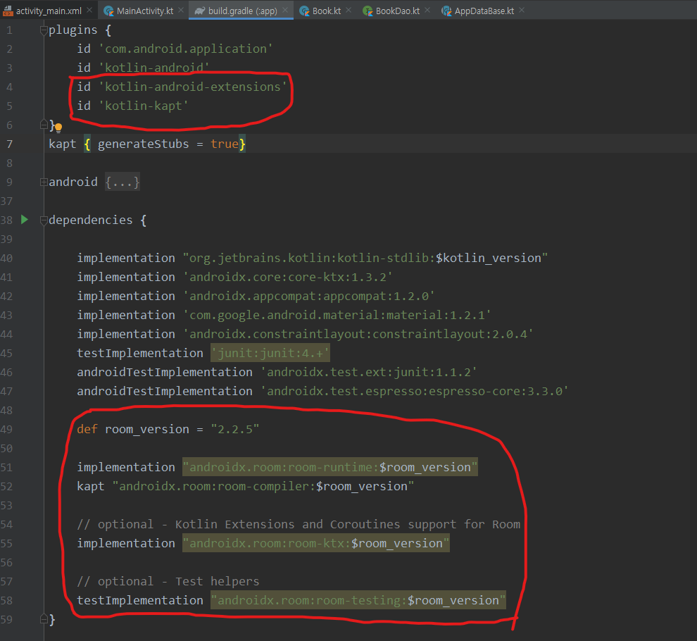 Room을 사용하기 위해서는 우선 Android 프로젝트를 생성 후 build.gradle 파일에 다음을 추가해주어야 한다.
