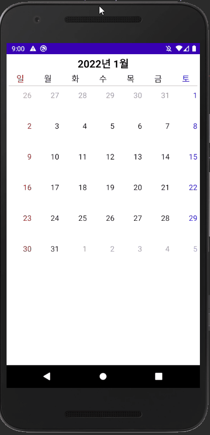 # 레이아웃은 최상단의 년과 월을 나타내는 TextView와 일요일~토요일을 표시하는 텍스트 그리고 일을 표시하기 위한 RecyclerView로 구성된다.