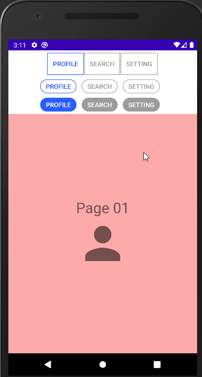 여기서 3개의 TabLayout은 각각 다른 스타일을 적용하였으며 동일한 ViewPager에 연결시키는 구조로 구성하였다.