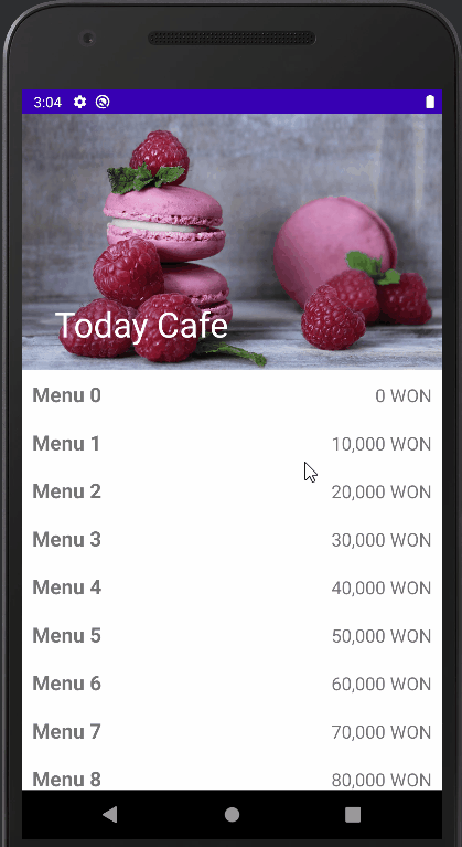 이에 추가적으로 RecyclerView를 아래 추가함으로써 아래로 스크롤되는 것에 따라서 App Bar가 어떻게 축소되며 고정되는가를 확인할 수 있다.