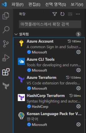 여기서 최종적으로는 Terraform을 사용하여 Azure 리소스를 목표로 하기 때문에, 아래 리스트는 기본적으로 필요하다고 생각되는 Extensions 목록으로 각각 설치해 주면 된다.