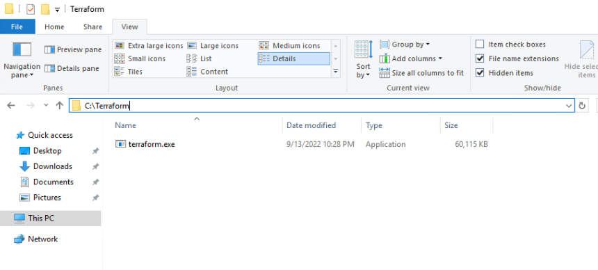 압축을 풀어준 후 나온 파일을 C드라이브 하단의 임의의 폴더(C:\Terraform)를 생성한 후 넣어준다.