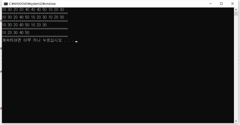 - 처음 unique 실행 후 결과를 확인하면 연속되며 중복되었던 20과 40은 사라졌지만 뒤에 10, 20, 30이 붙으며 vector의 크기는 변하지 않았다.