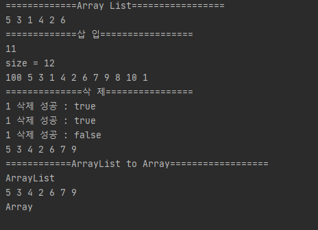 - arrayList를 array 변환하여 보면 기존 arrayList에서는 add로 원소를 삽입할 수 있었지만 array로 변환 후 삽입, 삭제가 불가하다.