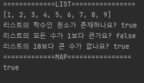- none : List에는 10보다 크다는 조건을 만족하는 원소가 하나도 존재하지 않으므로 true를 반환한다.