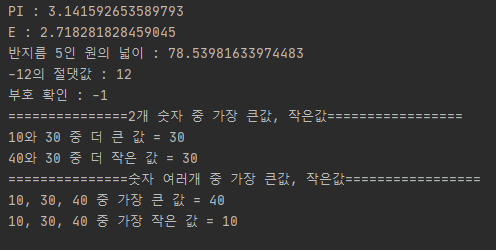 PI 값을 사용하여 원의 넓이를 구하거나 abs 함수를 사용하여 두 점 사이의 거리를 절댓값으로 구할 수도 있다.